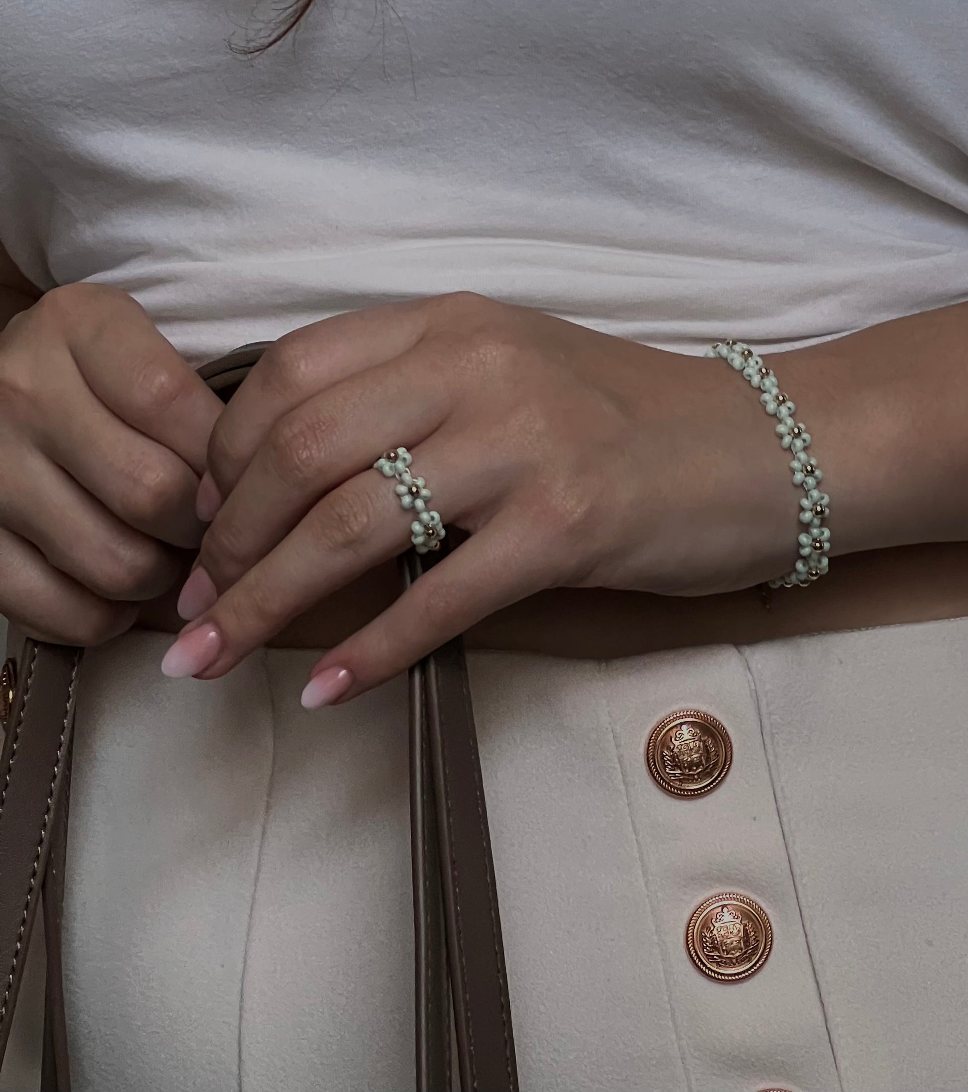 Náramek Elenia v jemné pastelové zelené barvě je elegantním symbolem klidu a svěžesti. Jeho světle zelený odstín připomíná jemné listy v ranní rose nebo svěží probuzení přírody na jaře. Ručně vyráběný květinkový náramek v pastelově zelené barvě, doplněný o jemné zlaté detaily, je tvořen z kvalitních skleněných korálků od českých výrobců. Spojení elegantního designu a precizního zpracování z něj dělá dokonalý doplněk pro každou příležitost.