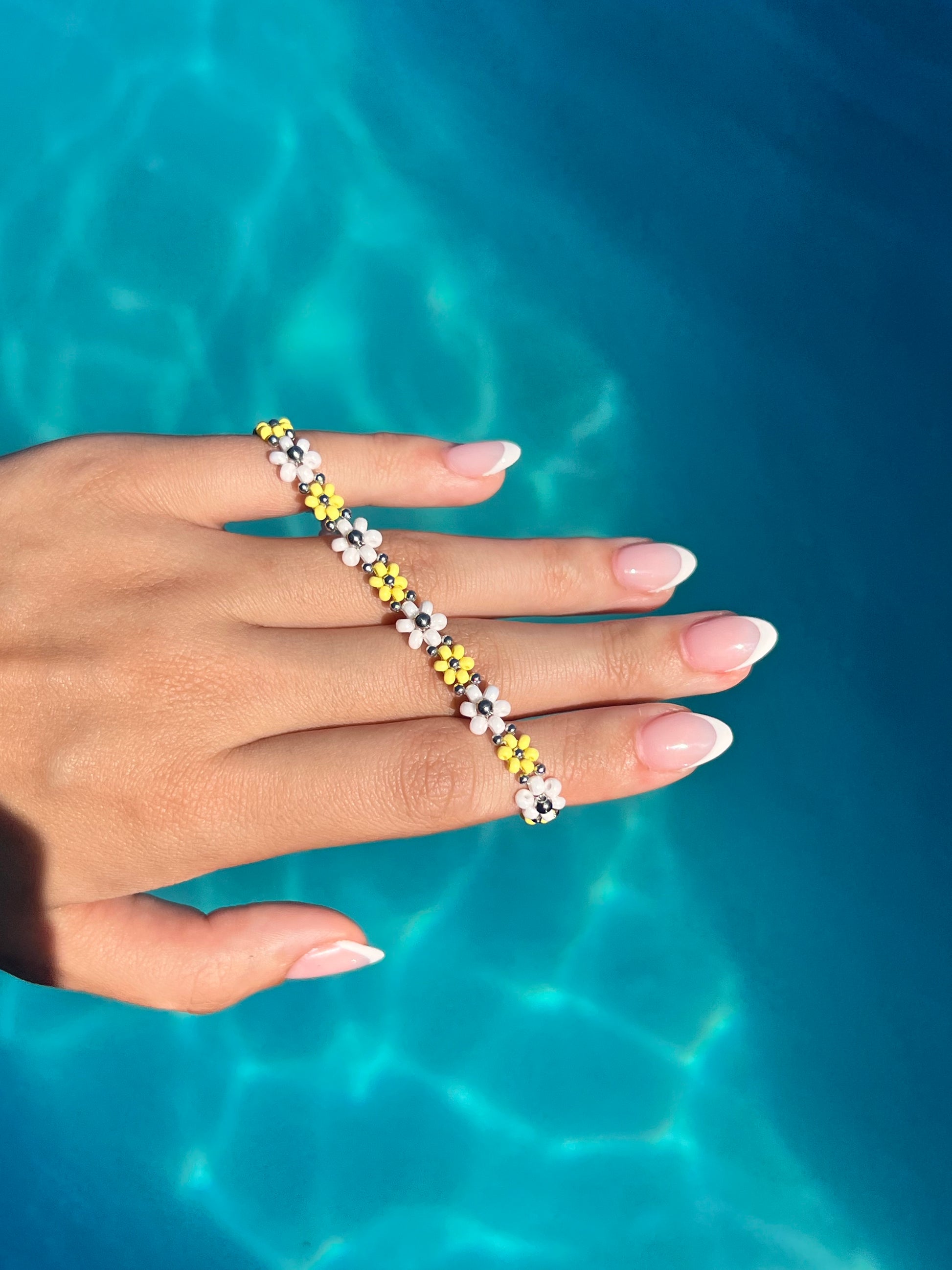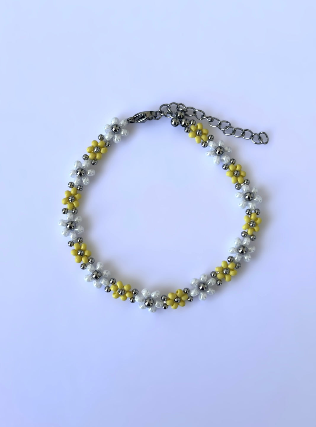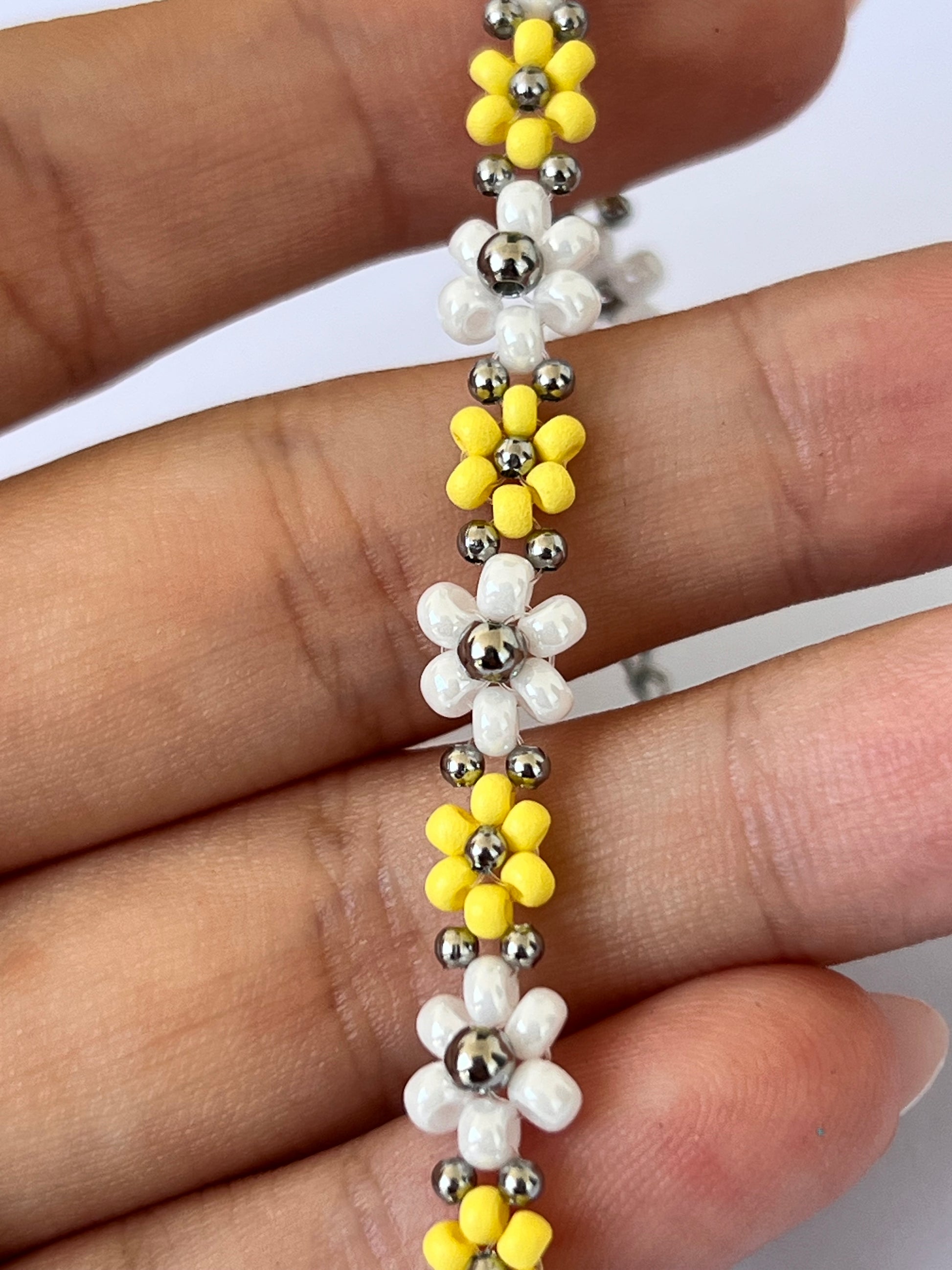 Náramek Elizabeth v jemné kombinaci bílé a slunečně žluté barvy připomíná rozkvetlou letní louku prozářenou paprsky ranního slunce. Jeho svěží a optimistické tóny působí radostným dojmem a v kombinaci s drobnými kvítky vytvářejí harmonii mezi hravostí a elegancí.