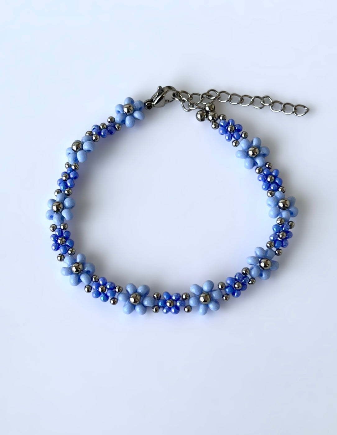 Ručně vyráběný květinkový náramek je tvořen z kvalitních českých skleněných korálků a doplněn o stříbrné detaily, které mu dodávají čistý, moderní vzhled.