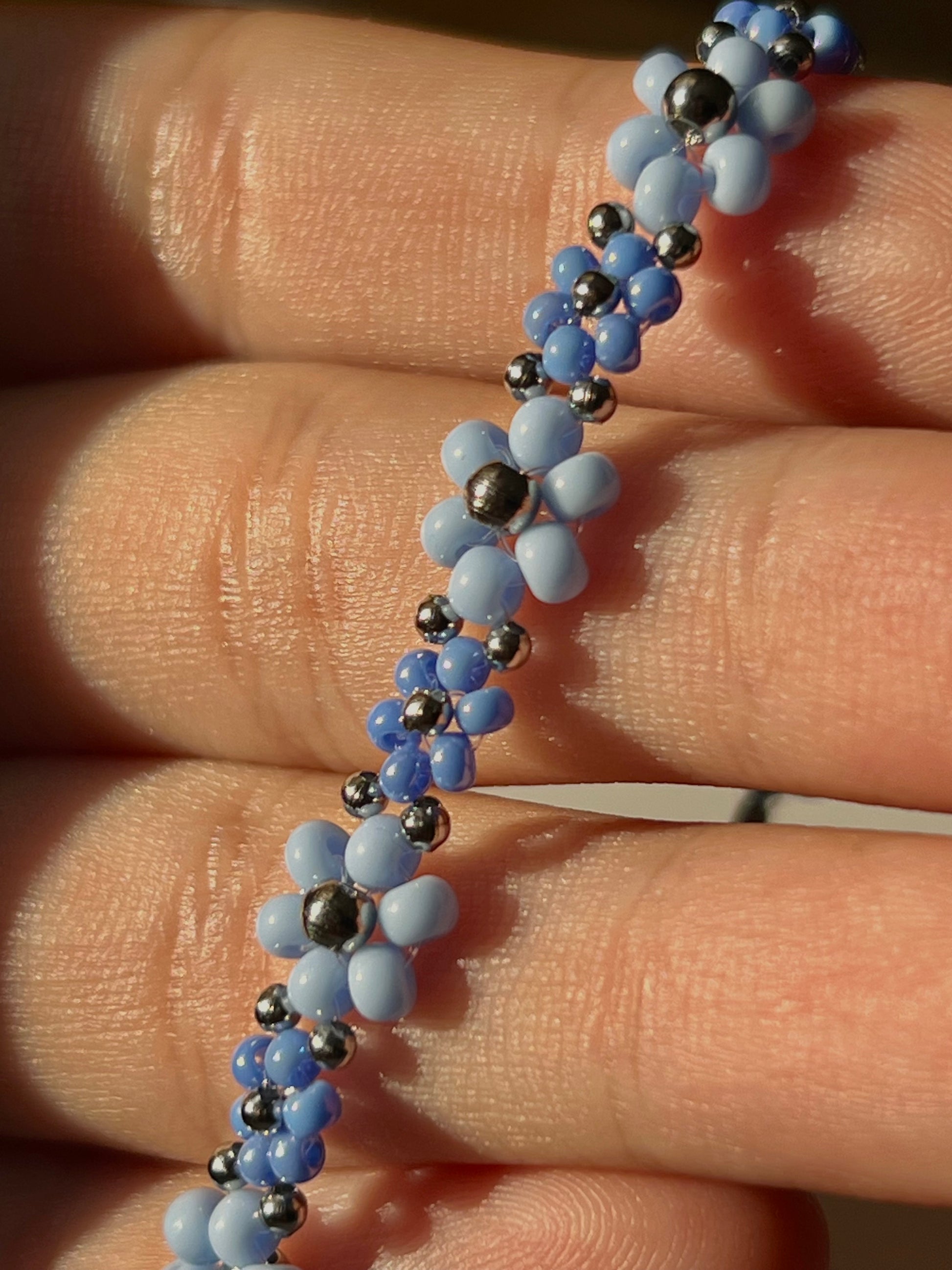 Náramek Lily v jemných odstínech modré připomíná klidné letní nebe a osvěžující šum mořských vln. Jeho chladivé a něžné tóny působí harmonicky a v kombinaci s drobnými kvítky vytvářejí pocit lehkosti a elegance.