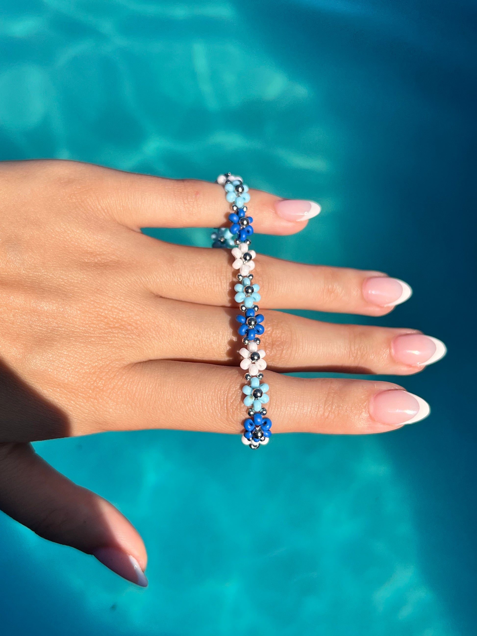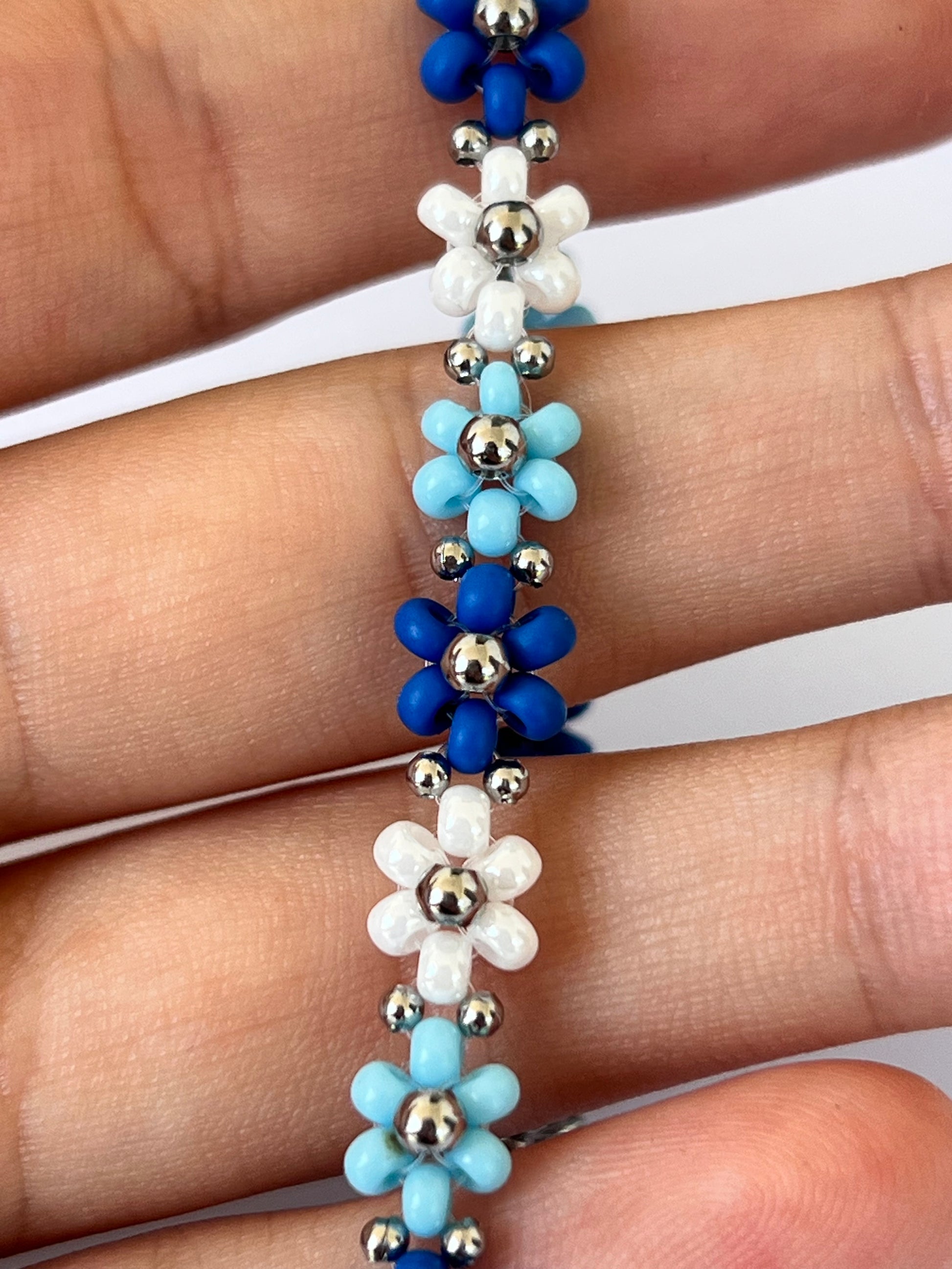 Náramek Mia v kombinaci bílé, světle modré a sytě modré barvy připomíná slunné pobřeží Řecka, kde se azurové moře setkává s bílými domky a jasnou oblohou. Jeho svěží a kontrastní tóny působí energicky a radostně, zatímco drobné kvítky dodávají jemný a elegantní nádech.