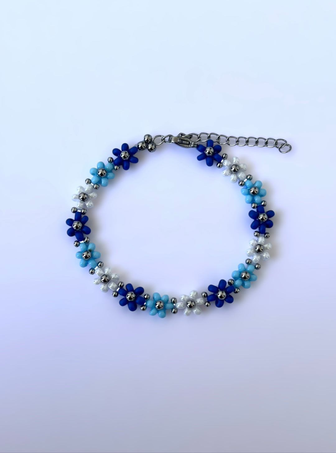 Ručně vyráběný květinkový náramek je tvořen z kvalitních českých skleněných korálků a doplněn o stříbrné detaily, které mu dodávají čistý, moderní vzhled.