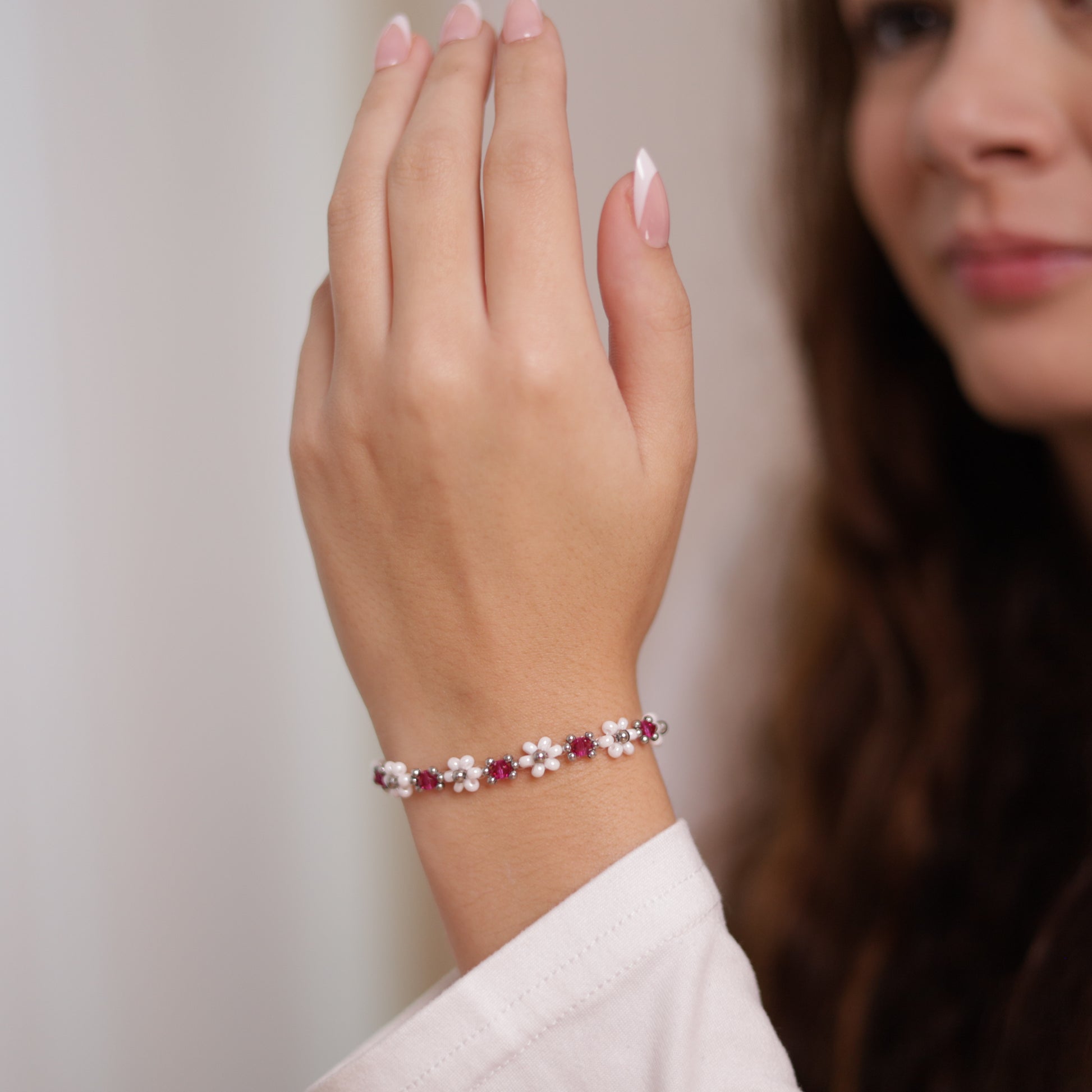 Náramek Rosetta přináší do vašeho stylu jemnou eleganci s romantickým nádechem. Jeho něžné perleťově bílé kvítky připomínají rozkvetlé květy v ranním světle, zatímco drobné růžové krystalky a stříbrné detaily dodávají celé kompozici decentní lesk a lehkost.