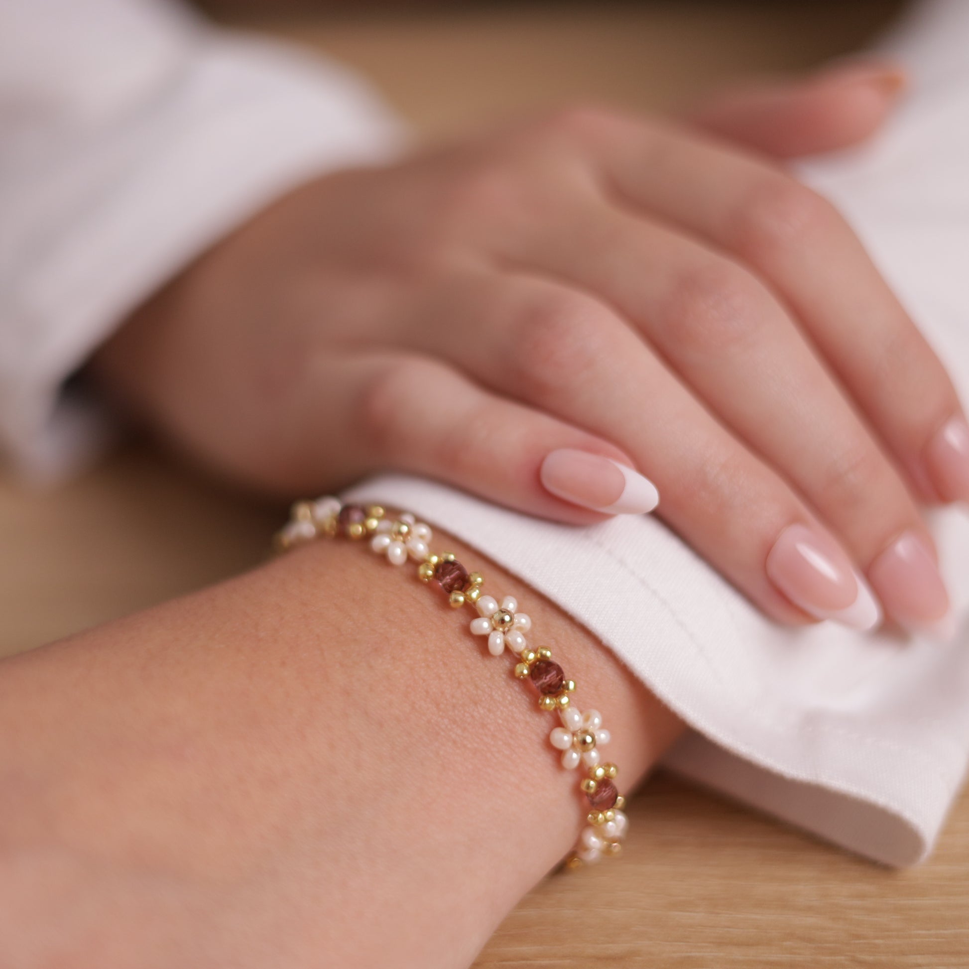 Náramek Bea v jemném béžovém odstínu s přídavkem fiolovo hnedych krystalů evokuje klid a přírodní harmonii. Jeho teplé tóny symbolizují vyrovnanost, pohodlí a spojení s přírodou. Ručně vyráběný květinkový náramek v béžové barvě, doplněný o jemné zlaté detaily, je tvořen z kvalitních skleněných korálků od českých výrobců. Spojení elegantního designu a precizního zpracování z něj dělá dokonalý doplněk pro každou příležitost. Díky univerzální velikosti s prodlužovacím řetízkem z chirurgické oceli (cca 5 cm) se přizpůsobí každému zápěstí a zajistí pohodlné nošení.