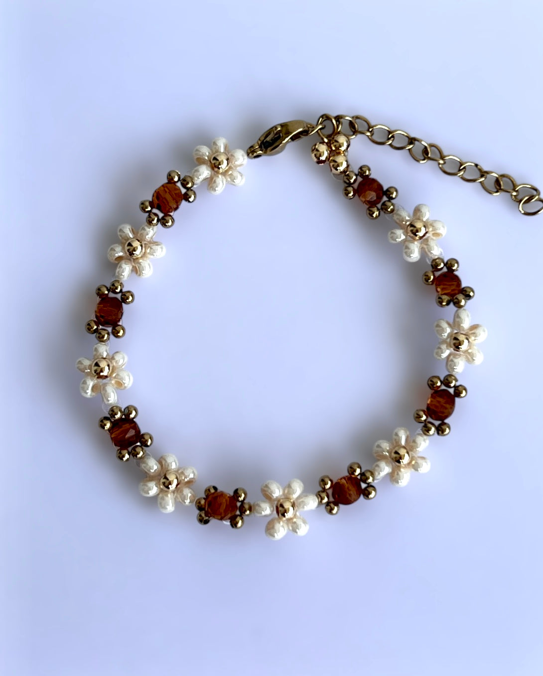 Náramek Bea v jemném béžovém odstínu s přídavkem hnědých krystalů evokuje klid a přírodní harmonii. Jeho teplé tóny symbolizují vyrovnanost, pohodlí a spojení s přírodou. Ručně vyráběný květinkový náramek v béžové barvě, doplněný o jemné zlaté detaily, je tvořen z kvalitních skleněných korálků od českých výrobců. Spojení elegantního designu a precizního zpracování z něj dělá dokonalý doplněk pro každou příležitost. Díky univerzální velikosti s prodlužovacím řetízkem z chirurgické oceli (cca 5 cm) se přizpůsobí každému zápěstí a zajistí pohodlné nošení.