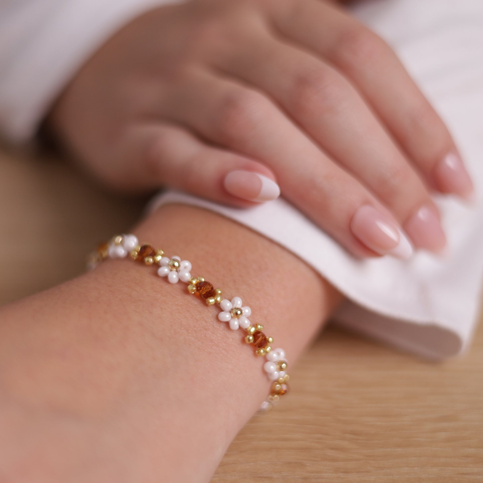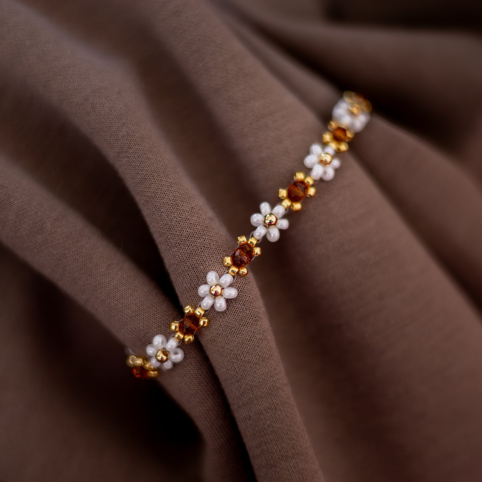 Náramek Thea v jemné bílé barvě s hnědými krystalky působí čistě a elegantně. Jeho kombinace světlých tónů a teplých hnědých detailů symbolizuje jednoduchost a přirozenou krásu. Ručně vyráběný květinkový náramek v bílé barvě, doplněný o jemné zlaté detaily, je tvořen z kvalitních skleněných korálků od českých výrobců. Spojení elegantního designu a precizního zpracování z něj dělá dokonalý doplněk pro každou příležitost. Díky univerzální velikosti s prodlužovacím řetízkem z chirurgické oceli (cca 5 cm) se přizpůsobí každému zápěstí a zajistí pohodlné nošení.